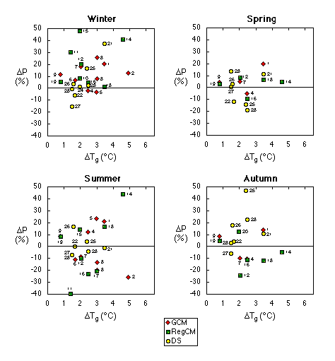 | Fig. 3: | Overview of precipitation scenarios for the European Alps. Shown are the scenario changes in the regionally and seasonally averaged total precipitation (dP) against the changes in the globally and annually averaged temperature (dTg) in the respective parent GCM simulations. GCM = scenarios from GCM simulations; RegCM = scenarios from time-slice experiments and RegCM-simulations; DS = scenarios from statistical downscaling. For numbering of the scenarios see Table 2. | pdf gif |