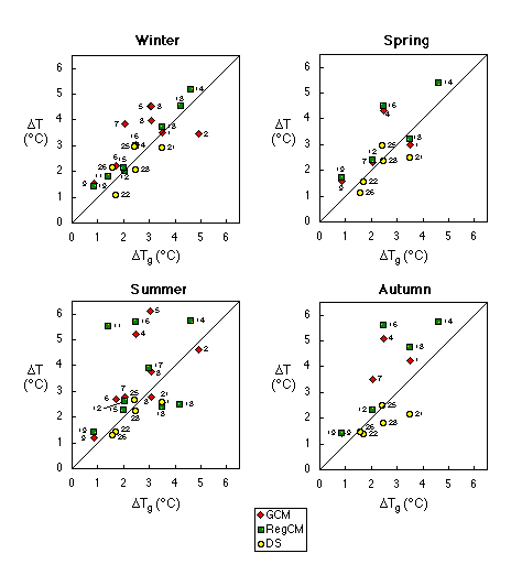 | Fig. 2: | Overview of temperature scenarios for the European Alps. Shown are the scenario changes in the regionally and seasonally averaged temperatures (dT) against the changes in the globally and annually averaged temperature (dTg) in the respective parent GCM simulations. GCM = scenarios from GCM simulations; RegCM = scenarios from time-slice experiments and RegCM-simulations; DS = scenarios from statistical downscaling. For numbering of the scenarios see Table 2. | pdf gif |